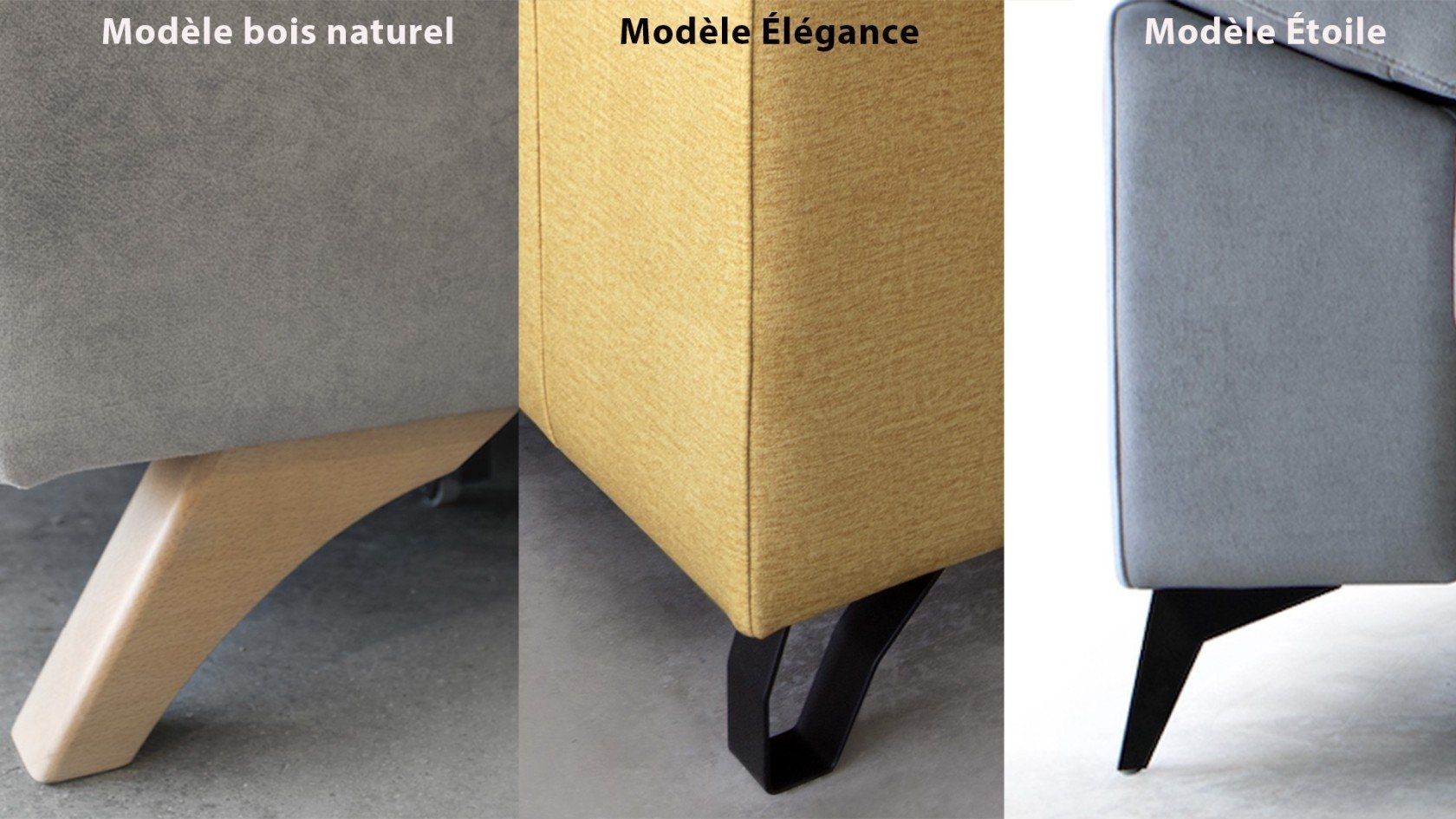 - Pieds métal noir modèle Étoile, pied métal noir modèle Élegance ou pied en bois naturel, hauteur 12 cm.