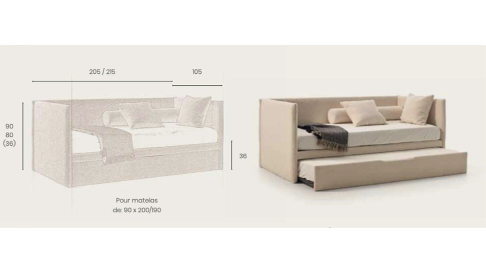 - Canapé-lit gigogne: Existe en 90x190 ou 90x200 cm pour un couchage totale de 180x190/200 cm