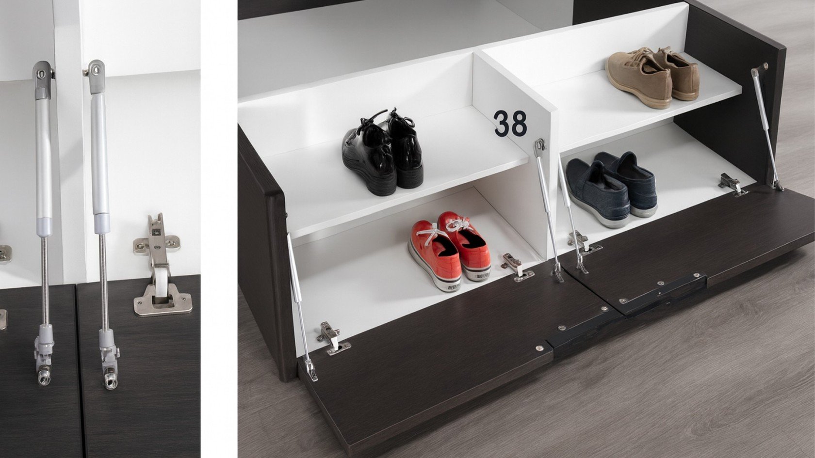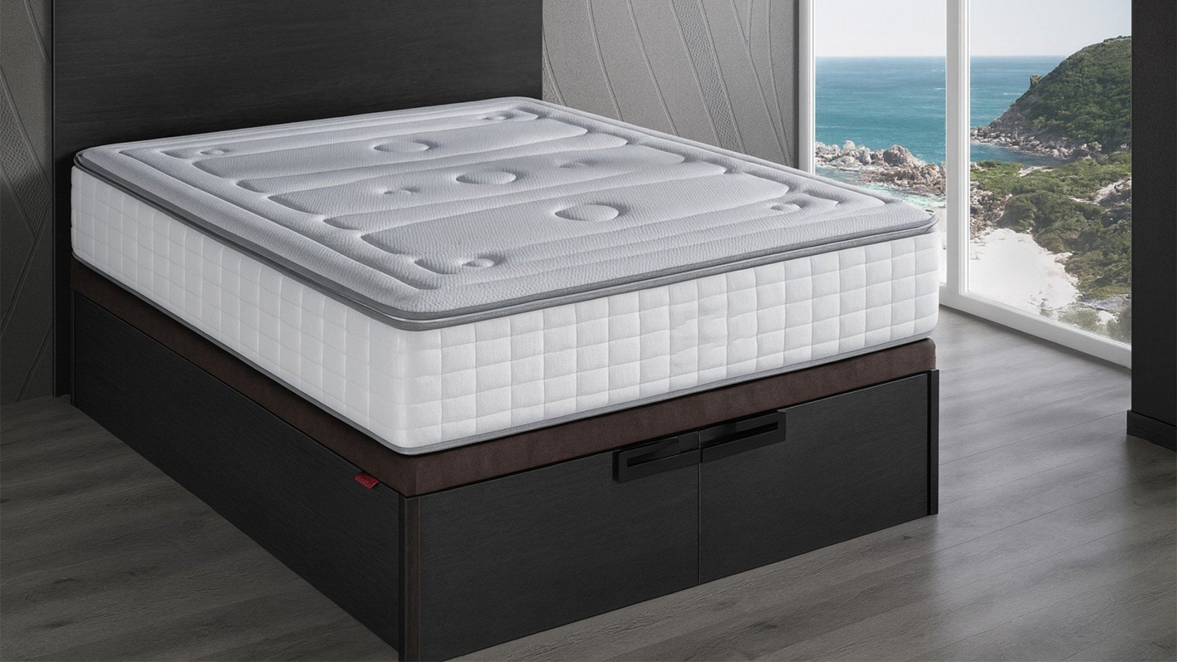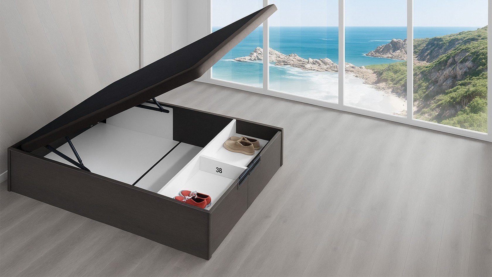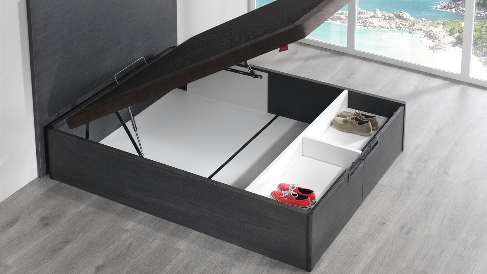 L'ouverture frontale du sommier est assistée par un mécanisme actionné par des amortisseurs à gaz, avec un système de fermeture sûr et un ajustement parfait à la structure évitant tout type de désalignement.