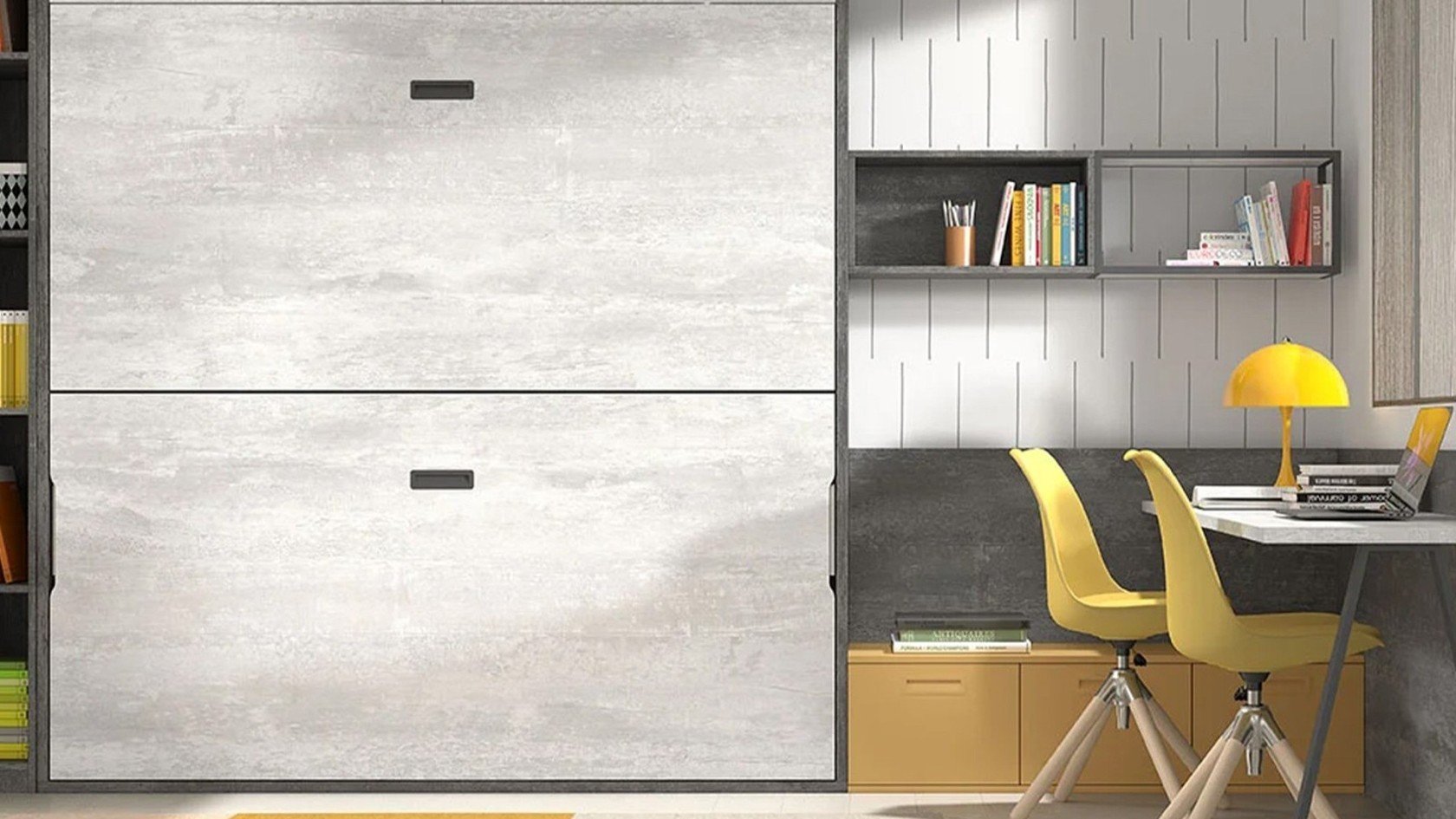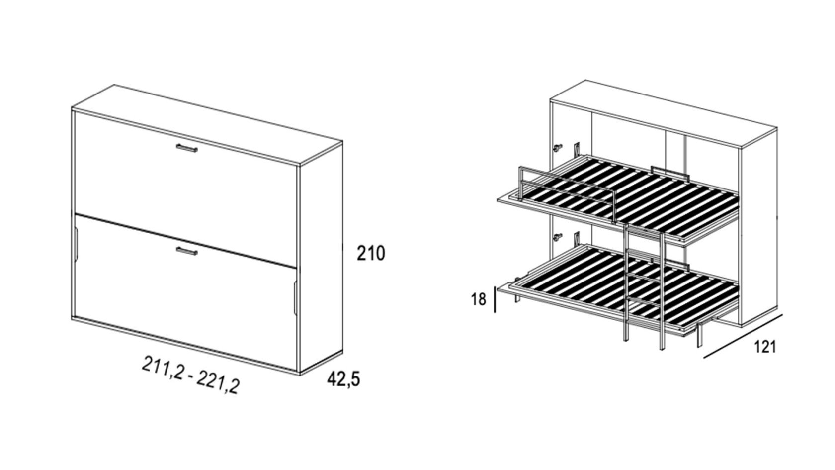 Un lit superposé horizontal escamotable très fonctionnel et polyvalent. 2 lits très confortables avec sommier et tout cela dans un minimum d'espace. Une solution gain de place excellente en plus de la fiabilité et de la grande sécurité de ce modèle équipé d'un système de verrouillage des pistons pour empêcher l'ouverture de la porte.