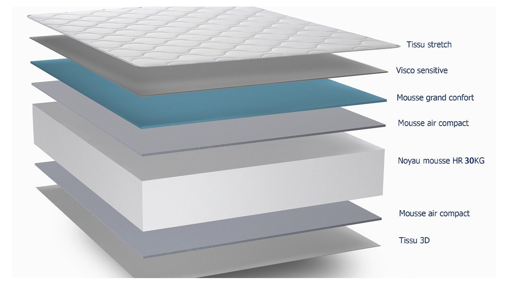 Il est composé de 2 cm de Sensus viscoélastique de 52 kg/m3 de densité, thermovariable et respirant, qui offre une fermeté moyenne avec un degré optimal d'adaptabilité et un repos confortable.